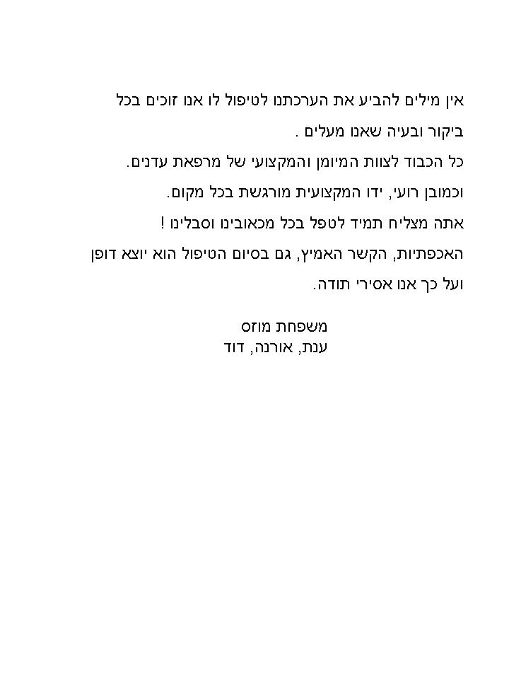 האכפתיות, הקשר האמיץ, גם בסיום הטיפול הוא יוצא דופן ועל כך אנו אסירי תודה.